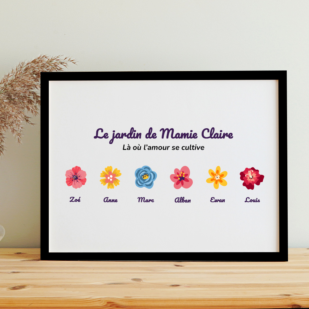 Avec son format idéal et son cadre noir élégant, cette affiche personnalisée prénoms enfants et fleurs trouvera facilement sa place dans n’importe quelle pièce. Un souvenir intemporel, qui rappellera chaque jour à votre maman ou grand-mère combien elle est aimée. Chaque regard posé sur cette affiche personnalisée famille fleurs lui rappellera l’amour inconditionnel de sa famille. Un cadeau touchant qui fera son effet à coup sûr !