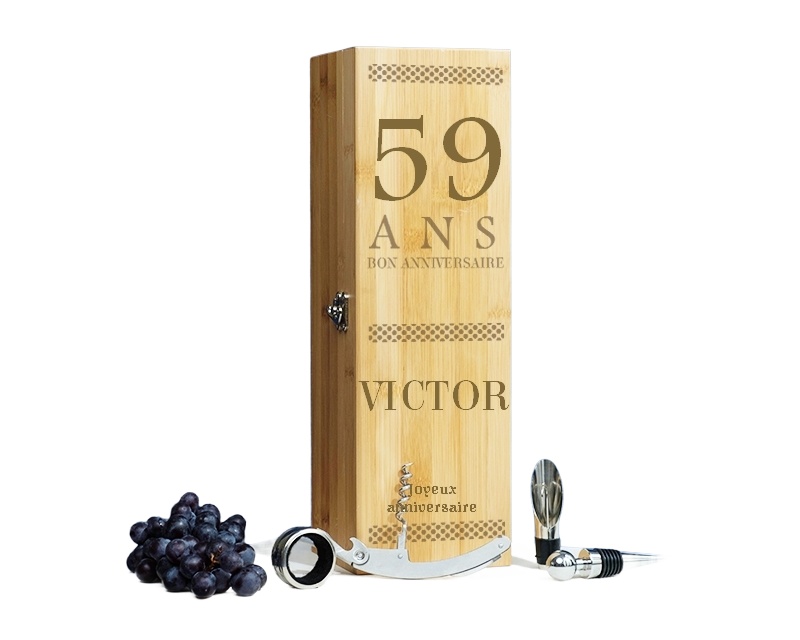 Pour célébrer les 59 ans d'un homme amateur de vin, le coffret sommelier 4 accessoires personnalisable est un cadeau parfait. Ce coffret sommelier est idéal pour tout passionné de vin qui apprécie déguster et servir ses précieuses bouteilles avec élégance. Que ce soit pour un anniversaire, une fête spéciale ou simplement pour faire plaisir à un ami cher, ce cadeau vin homme saura ravir les papilles et le cœur.