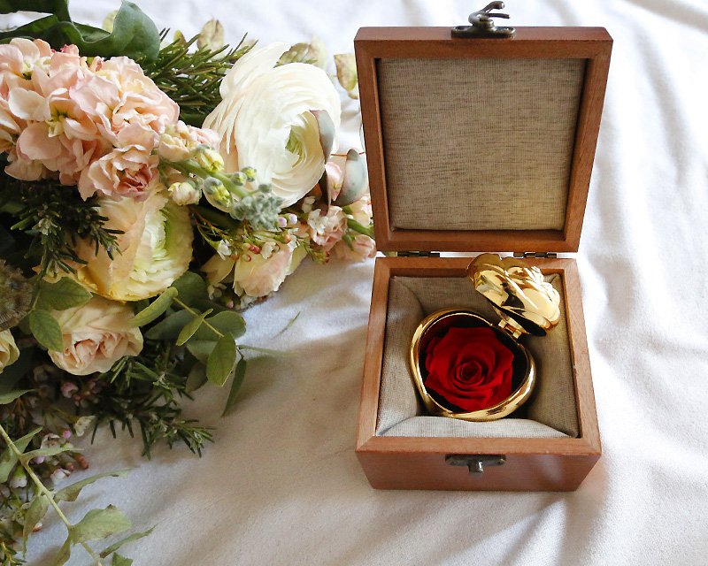 - Bouton de rose en or et rose éternelle secrète dans son coffret en bois gravé : Un cadeau symbolique et éternel qui se conserve précieusement toute une vie, témoignant de l'affection et de l'attention portées à la destinataire.