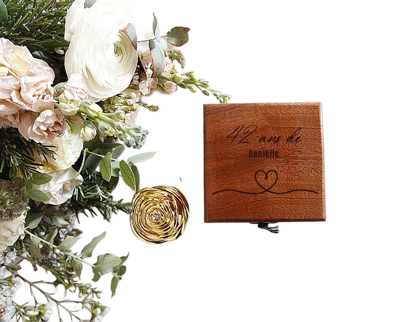 Dans ce magnifique coffret en bois, se cache un trésor précieux pour célébrer les 42 ans d'une femme spéciale : un bouton de rose en or accompagné de sa rose éternelle. Imaginez le bonheur de recevoir un tel cadeau, empreint de délicatesse et d'éternité, personnalisé pour elle et gravé avec amour. Cette rose éternelle, symbole intemporel de beauté et de passion, sera chérie et admirée pour les années à venir.