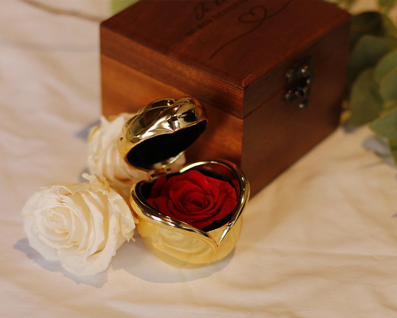 3 Points Forts du produit : - Bouton de rose en or et sa rose éternelle secrète dans son coffret en bois gravé : Un cadeau raffiné et précieux qui perdurera dans le temps. - Personnalisé au laser par nos équipes de Laval en Mayenne : Chaque coffret est unique et gravé avec soin pour une touche personnelle inimitable. - Conservation de toute une vie : La rose éternelle reste fraîche et éclatante sans nécessiter d'entretien, offrant ainsi un souvenir durable et significatif.