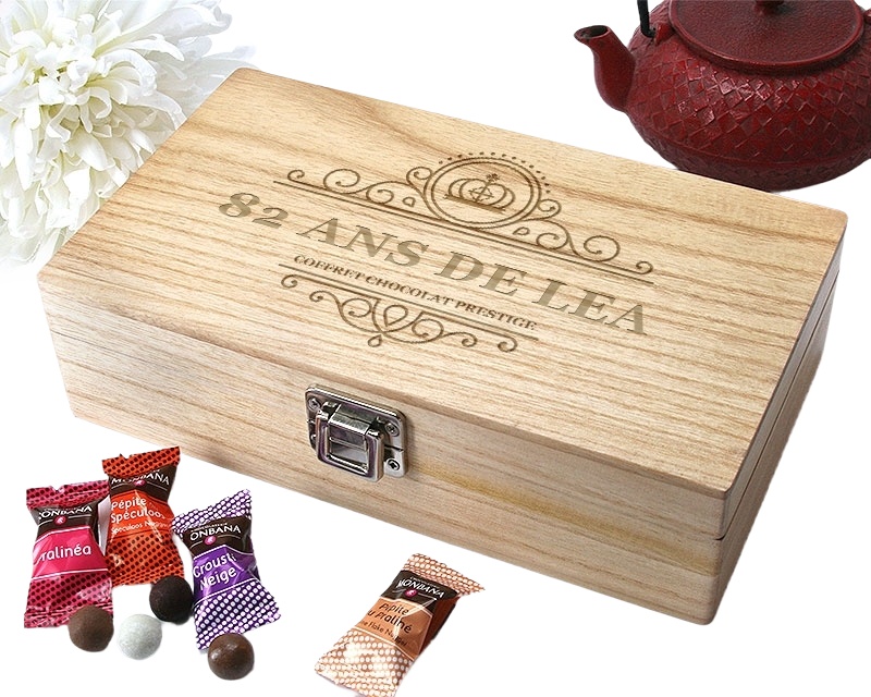 Pour célébrer les [82] ans d'une femme spéciale, rien de tel qu'un coffret bois chocolats Monbana personnalisé! Ce magnifique coffret chocolat personnalisé femme est un cadeau parfait pour marquer cet événement inoubliable. Imaginez sa surprise et son bonheur en découvrant ce coffret cadeau chocolat élégant, renfermant un mix exquis de 40 billes de chocolat Monbana.