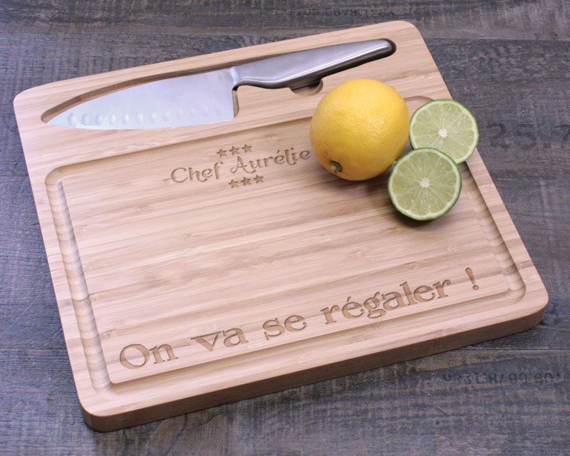 Cette planche à découper rectangulaire en bambou est non seulement fonctionnelle, mais aussi élégante. Elle est accompagnée d'un couteau en acier inoxydable de grande qualité qui se fixe à la planche grâce à un aimant, offrant ainsi une solution de rangement pratique. De plus, la gravure laser réalisée avec soin par nos experts à Laval en France ajoute une touche personnalisée et raffinée à ce cadeau déjà exceptionnel.