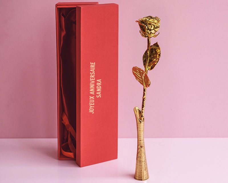 Offrez cette rose en or et son écrin personnalisé pour célébrer les 54 ans d'une femme exceptionnelle. Que ce soit pour un anniversaire, une fête des mères ou toute autre occasion spéciale, cette rose éternelle en or incarne l'amour et l'élégance, faisant de chaque instant un souvenir mémorable.