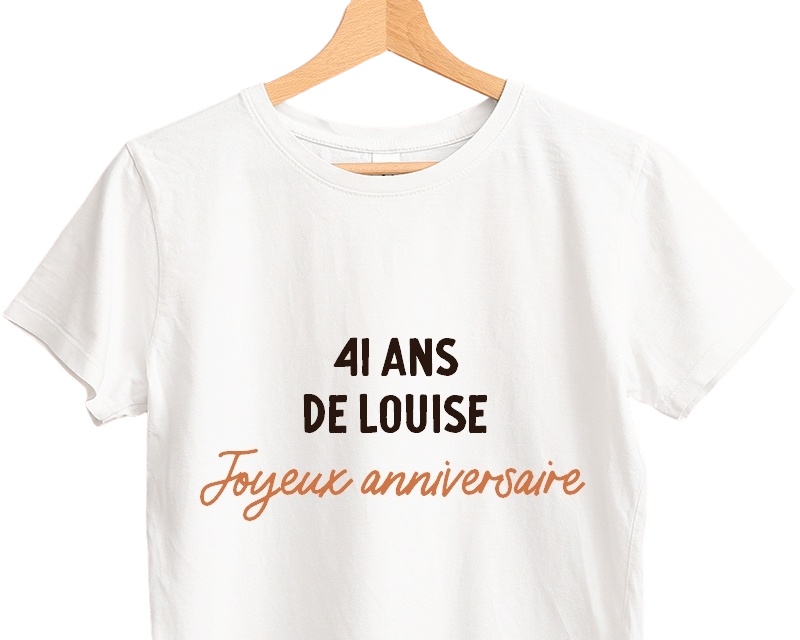 Le tshirt blanc femme personnalisé est un cadeau parfait pour célébrer les 41 ans d'une femme spéciale dans votre vie. Ce t-shirt blanc intemporel, personnalisable avec un message générique, est un choix polyvalent qui peut être porté en toute occasion. Que ce soit pour un anniversaire, la fête des mères, la Saint-Valentin ou simplement pour exprimer votre amour et votre gratitude, ce tshirt personnalisé sera un cadeau mémorable et unique.