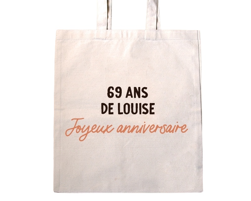 Pour célébrer les 69 ans d'une femme spéciale, rien de tel qu'un tote bag personnalisé qui allie style et praticité. Imaginez sa joie en recevant ce tote bag personnalisé femme, un accessoire à la fois tendance et fonctionnel. Parfait pour accompagner toutes ses sorties, du shopping en ville aux balades en nature, ce tote bag en coton de haute qualité saura la séduire par sa robustesse et son côté éco-responsable.