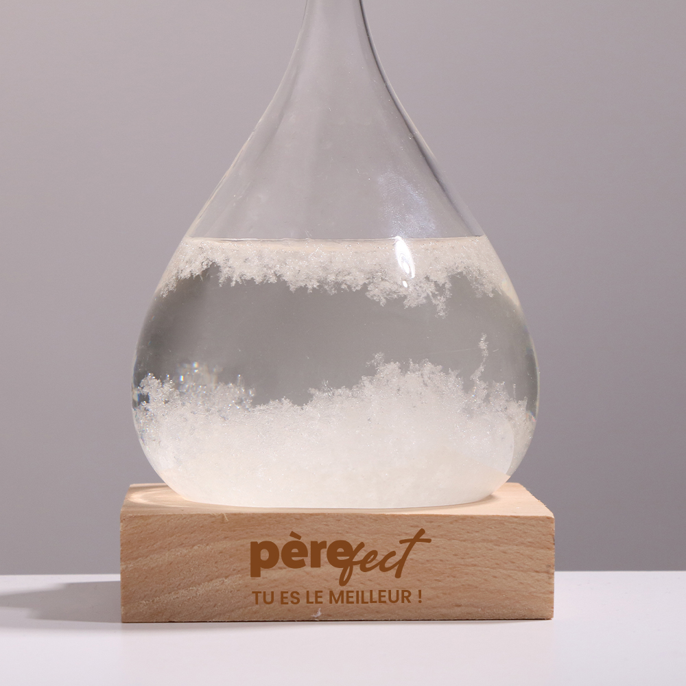 Que ce soit pour la Fête des Pères, un anniversaire ou Noël, ce storm glass personnalisé fera fondre le cœur des papas, jeunes ou expérimentés. Il touche par son originalité, séduit par son élégance, et amuse par son jeu de mots malicieux. Un cadeau original personnalisé qui fera sourire et émouvoir à chaque regard posé sur lui.