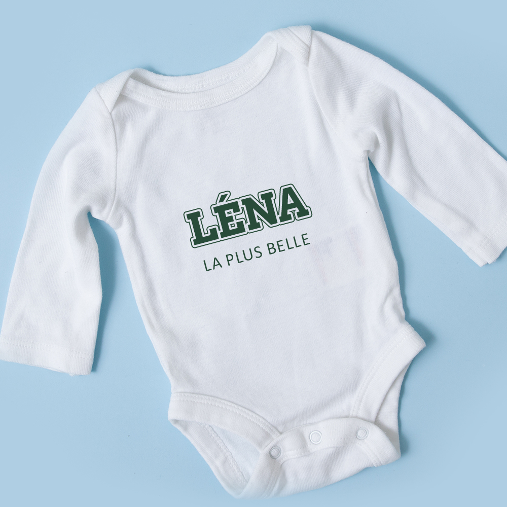 Avec sa typographie inspirée des universités américaines et ses deux lignes de texte personnalisables, ce body se transforme en véritable clin d’œil tendre et décalé. Parfait pour une naissance, un premier anniversaire ou un shooting souvenir, il habille les tout-petits avec humour et élégance.