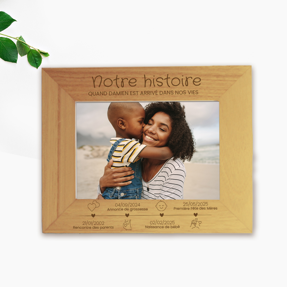 Ce cadre photo personnalisé bois en format paysage est un hommage délicat aux tout premiers instants d’une vie de famille. Il met en lumière les étapes fondatrices d’une belle histoire : la rencontre des parents, l’annonce de la grossesse, la naissance du bébé et la première fête des mères. Chaque jalon est symbolisé par un petit pictogramme poétique et accompagné d’une date personnalisée, d’un titre et d’un sous-titre au choix.