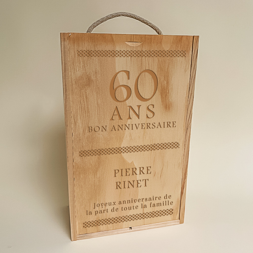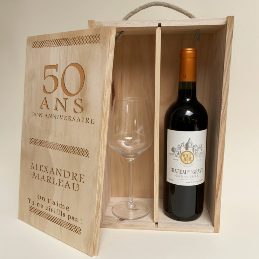 Un cadeau qui célèbre un âge marquant et crée un vrai souvenir. Ce coffret luxe vin est gravé à votre image pour transformer une date symbolique en moment d’émotion, entre élégance, utilité et plaisir de partager. Un véritable coffret vin personnalisé qui trouvera sa place sur la table comme dans le salon.