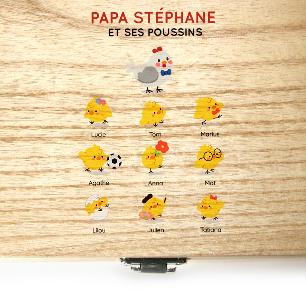 Offrir du chocolat, c’est toujours une belle attention, mais offrir un coffret chocolat personnalisé famille avec les prénoms des enfants ou petits-enfants et un design adorable de poussins, c’est un cadeau unique et rempli d’amour. Imaginez la surprise et l’émotion de votre être cher découvrant une boîte en bois élégamment gravée avec son prénom et celui de ses petits poussins.