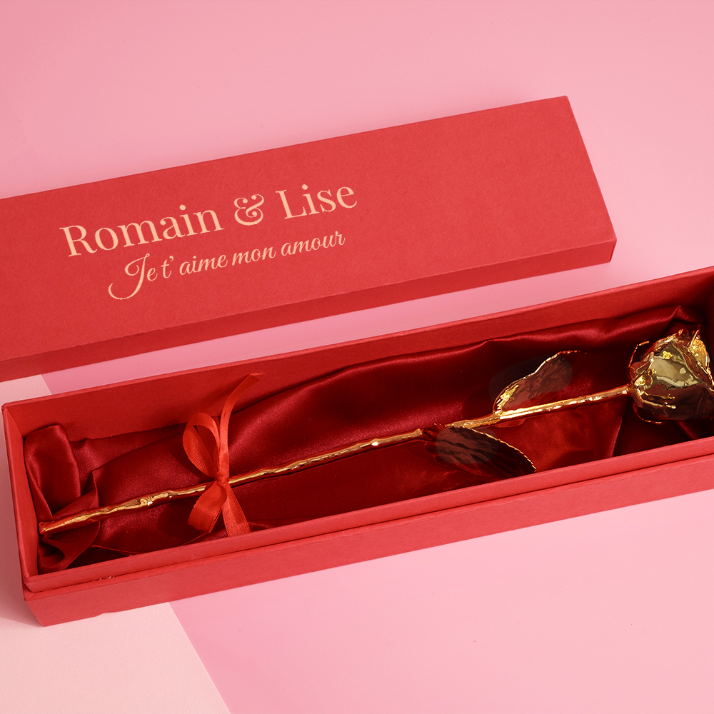 Ce coffret comprend également une magnifique rose en or 24 carats, présentée dans un écrin personnalisé. La gravure de vos initiales sur l’écrin ajoute une dimension unique et intime à ce cadeau. Symbole intemporel de l’amour, cette rose est le parfait souvenir à conserver précieusement.