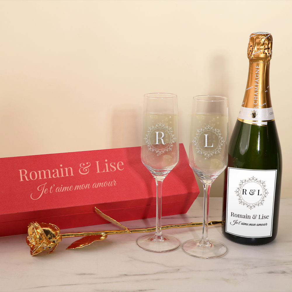 Accompagnez votre champagne de deux flûtes à champagne gravées, personnalisées avec vos initiales. Élégantes et sophistiquées, elles sont conçues pour rehausser chaque instant partagé à deux, tout en apportant une touche de luxe à vos célébrations.