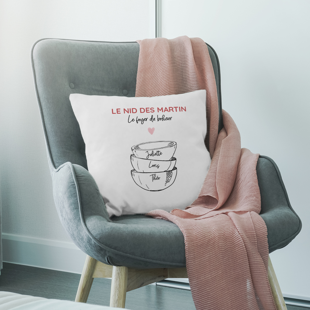 Disponible en deux variantes, ce coussin famille personnalisé vous laisse choisir entre le design bol breton emblématique, parfait pour une touche traditionnelle et régionale, ou un bol classique, pour un rendu plus sobre et élégant. Un véritable hommage aux moments partagés en famille !