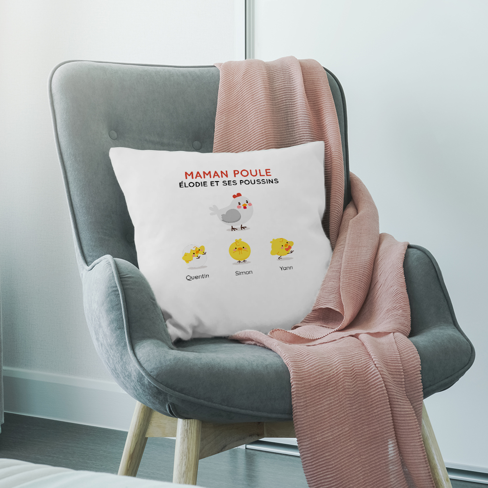 Avec son design unique, choisissez une poule adulte, les petits poussins représentant chaque membre de votre tribu, et ajoutez les prénoms et un message doux. Ce coussin personnalisé famille est un souvenir tendre et amusant, idéal pour marquer les fêtes des mamies, des mamans, des papas ou des papis.