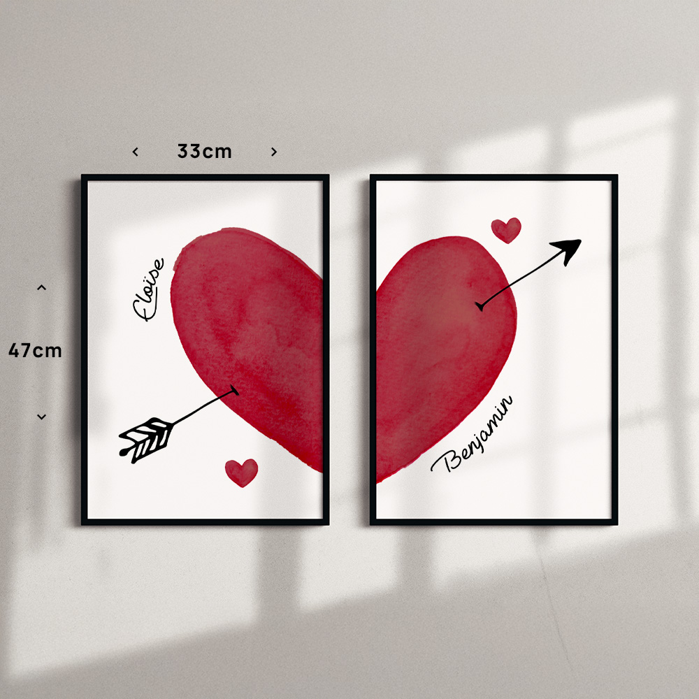 Célébrez votre amour avec ce duo d’affiches personnalisées, parfaites pour habiller votre intérieur d’une touche romantique. Chaque affiche illustre une moitié de cœur, qui ne prend tout son sens qu’une fois réunie avec l’autre. Personnalisez-les avec vos prénoms pour créer une décoration unique et pleine de sens.
