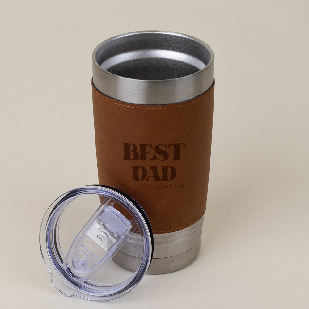 Avec sa grande contenance de 590 ml et son couvercle en plastique fonctionnel, cette gourde thermos permet de garder ses boissons préférées à portée de main. La personnalisation gravée directement sur le similicuir offre une finition chic et durable, parfaite pour un papa qui aime les beaux objets et les petites attentions pleines de sens.