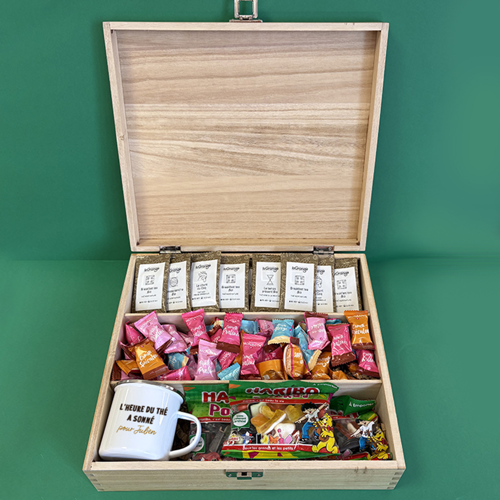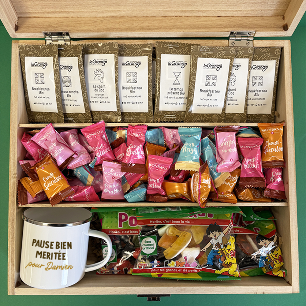 Offrez une délicieuse parenthèse de douceur avec cegrand coffret gourmand en bois personnalisable, pensé pour les amoureux des petites pauses sucrées. Gravé au nom de son destinataire, il renferme un assortiment aussigourmand qu’élégant: unmug émaillé personnalisable,16 sachets de thé,3 paquets de bonbons Hariboet60 billettes de chocolat Monbana.