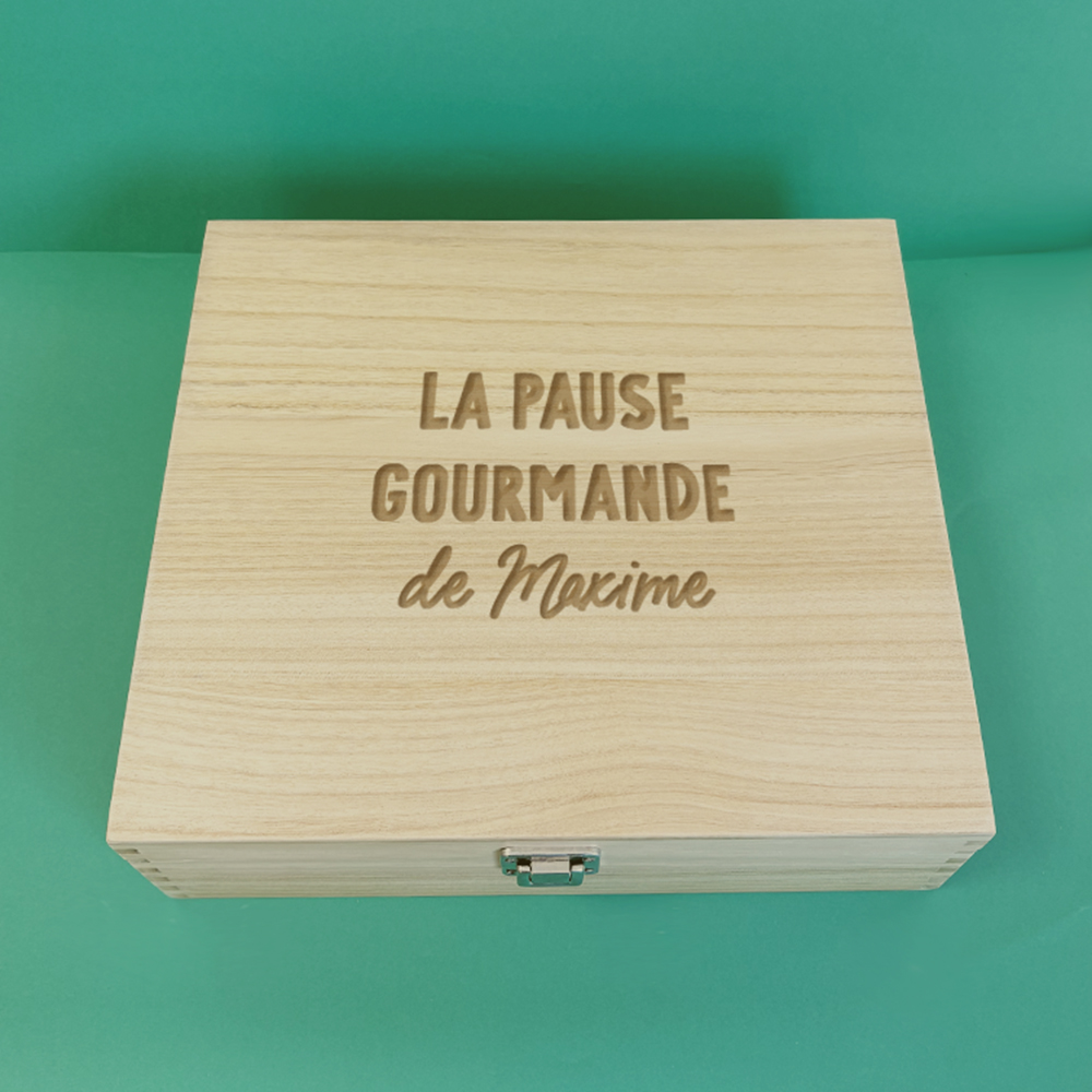 Un écrin de bois à graver, un mug à personnaliser, et une avalanche de douceurs pour faire fondre les gourmands de bonheur !