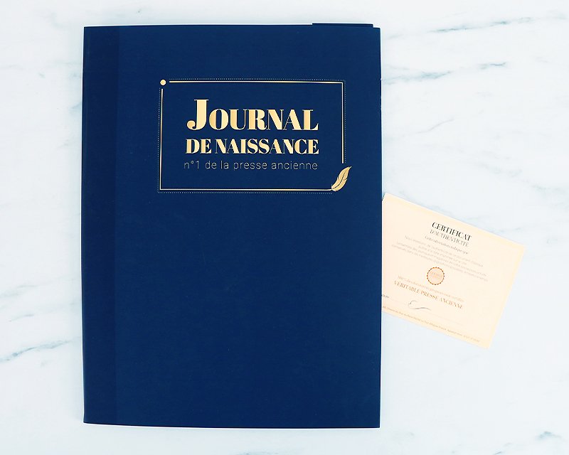 - Option 1 journal avec écrin simple : un titre de presse quotidienne aléatoire daté de la date de naissance, accompagné d'un certificat d'authenticité et d'un coffret simple en papier bleu marine sur lequel est inscrit "Le journal de l'anniversaire" en lettres dorées