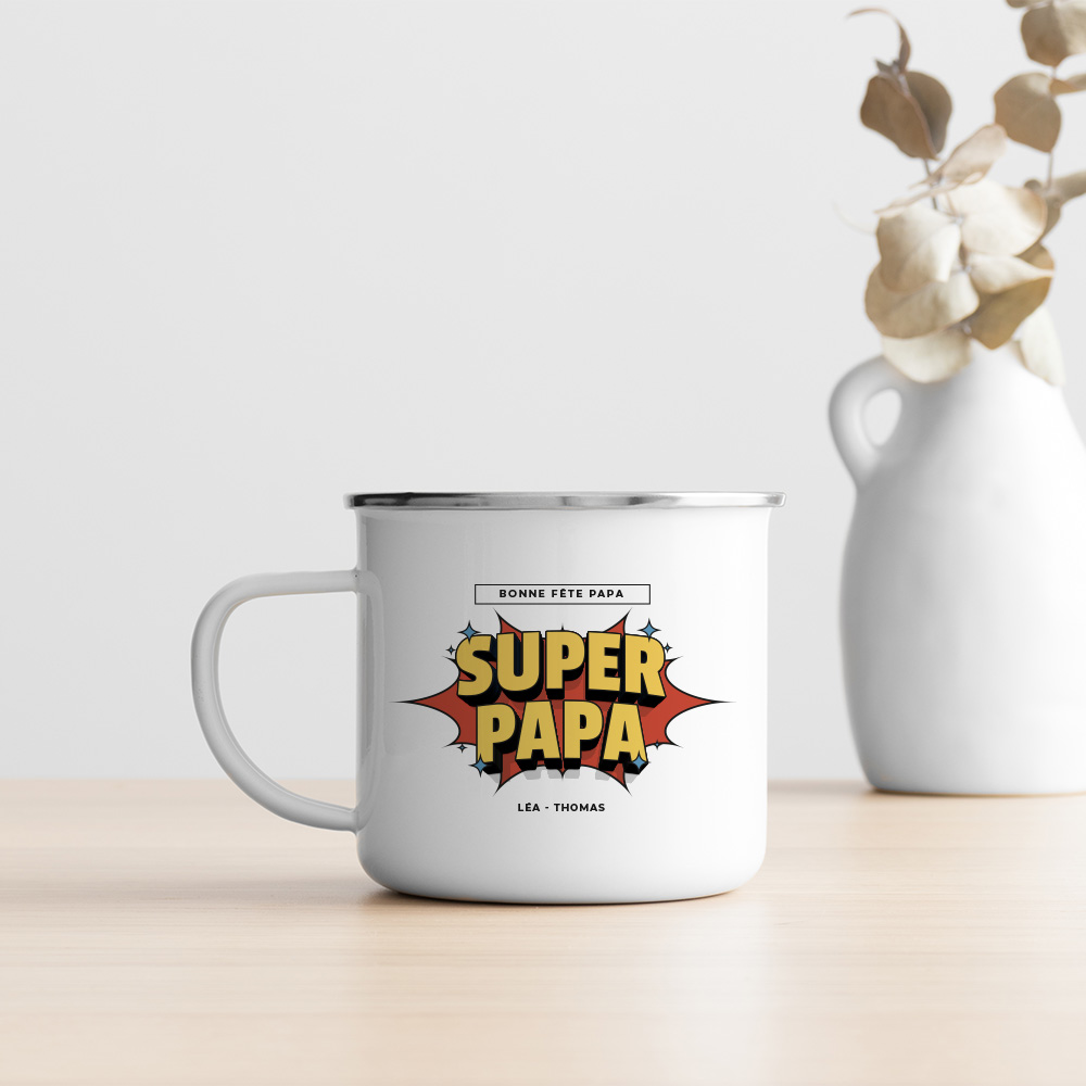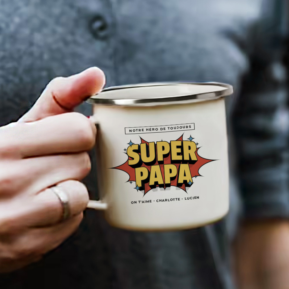 Ce mug émaillé personnalisé est parfait pour la Fête des Pères, un anniversaire ou Noël. Il déclenche immédiatement un sourire de fierté et un sentiment de reconnaissance, en mettant en scène le papa comme un héros vu par ses enfants. Un petit objet du quotidien chargé de symbolique.