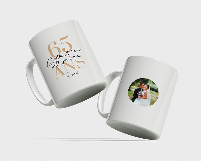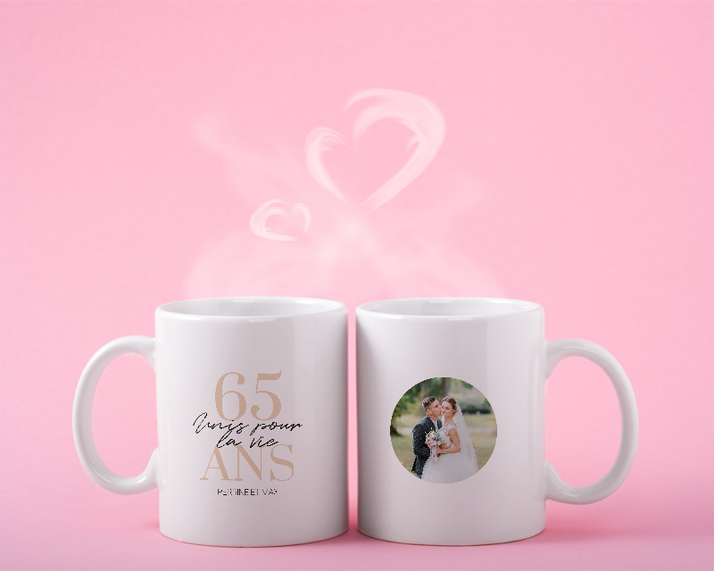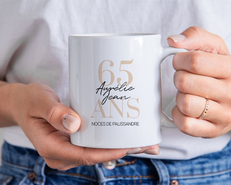 À l'occasion des 65 ans de mariage, les noces de Palissandre, offrez un cadeau exceptionnel pour célébrer cette étape rare et précieuse. Notre mug personnalisé en céramique blanche de haute qualité est le choix idéal pour honorer cet anniversaire de mariage remarquable.