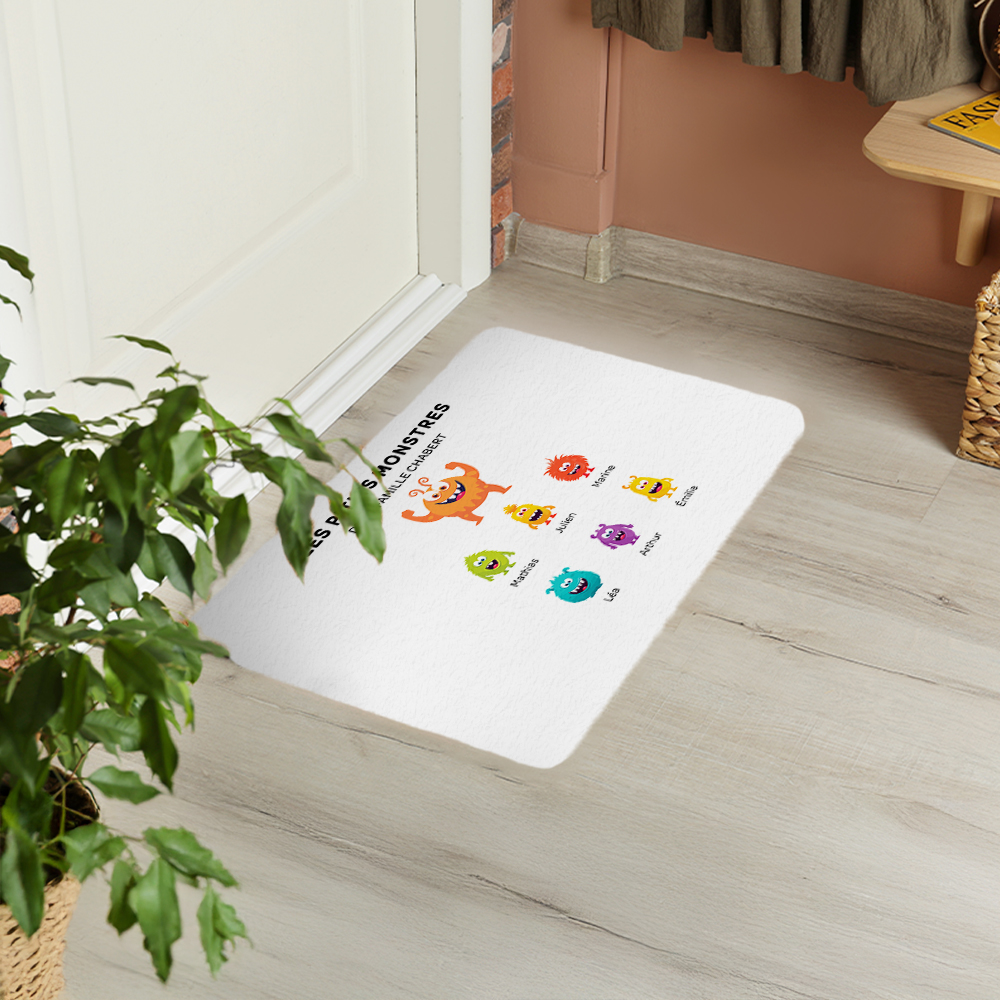 Personnalisez votre tapis personnalisé en ajoutant les prénoms des membres de votre famille et en choisissant parmi plusieurs petits monstres et monstres adultes pour une création qui vous ressemble. Une manière originale et ludique d’annoncer la couleur dès le seuil de votre porte !