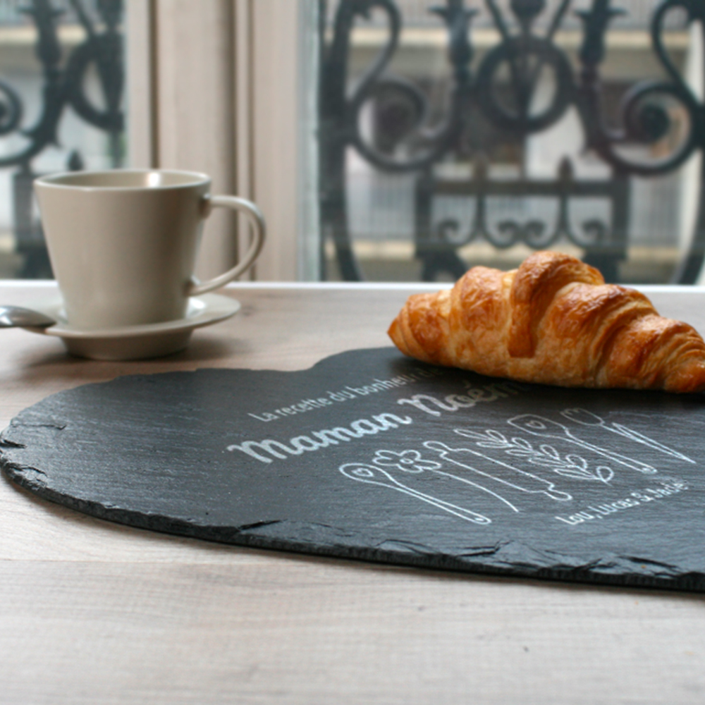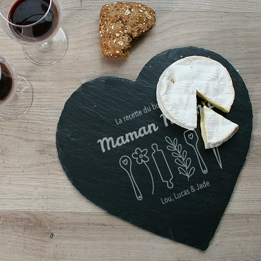 La collection Recette du Bonheur transforme les objets du quotidien en souvenirs durables. Ce plateau ardoise cœur personnalisé est un symbole de la douceur, de la générosité et de la place unique qu’occupe maman dans la cuisine comme dans le cœur de ses proches.