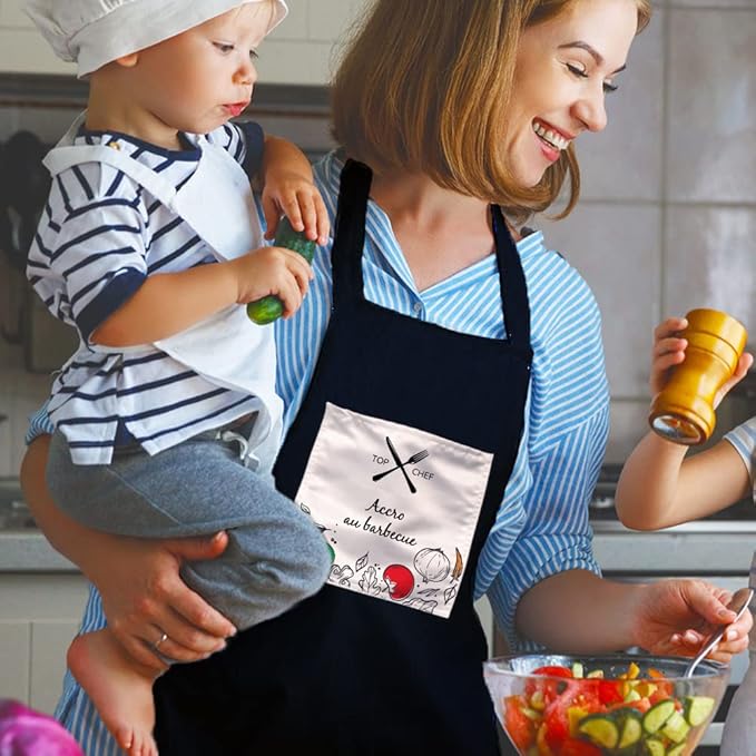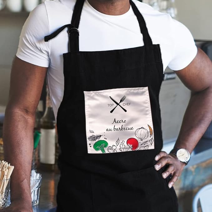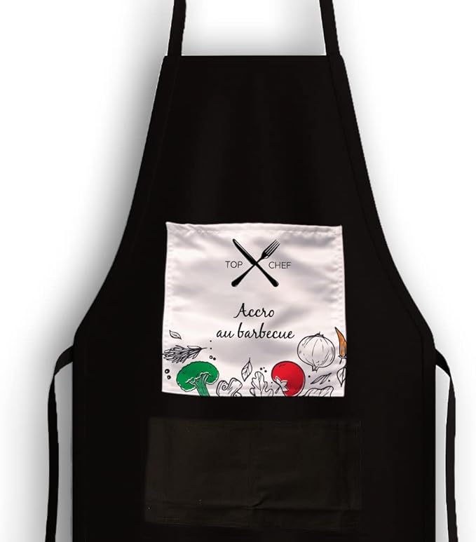 Avis aux amoureux du grill : ce tablier “Accro au barbecue” est fait pour vous ! Avec son look moderne et sa grande poche avant, il est le compagnon idéal pour tous les cuisiniers du plein air.