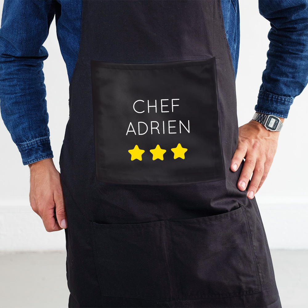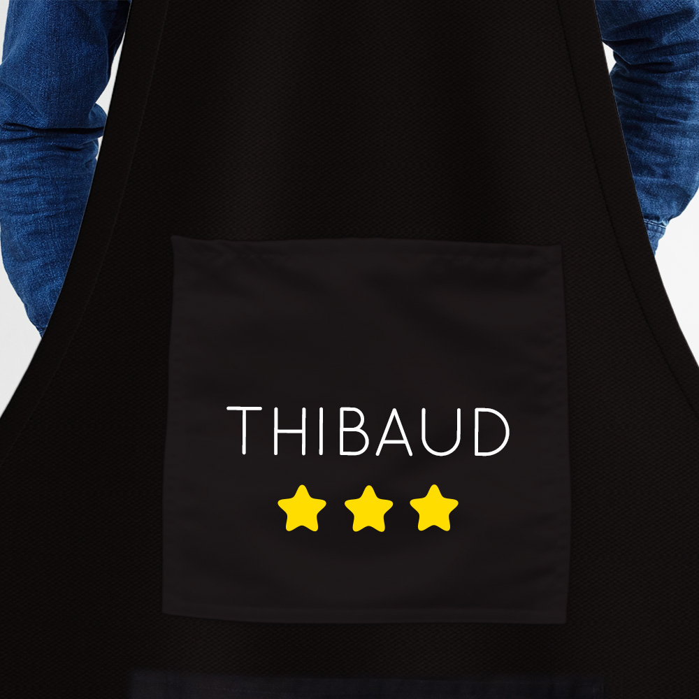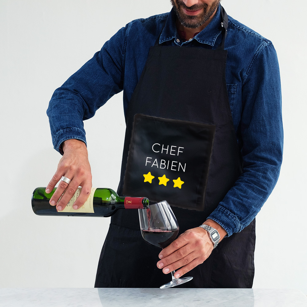 Look sobre et pro sur fond noir, prénom centré en typographie claire et symboles étoilés façon chef pour un rendu moderne et valorisant. La personnalisation du prénom crée un objet unique, pensé pour les passionnés de cuisine, papas gourmands, mamans cordons-bleus, amis épicuriens ou collègues fans de barbecue.