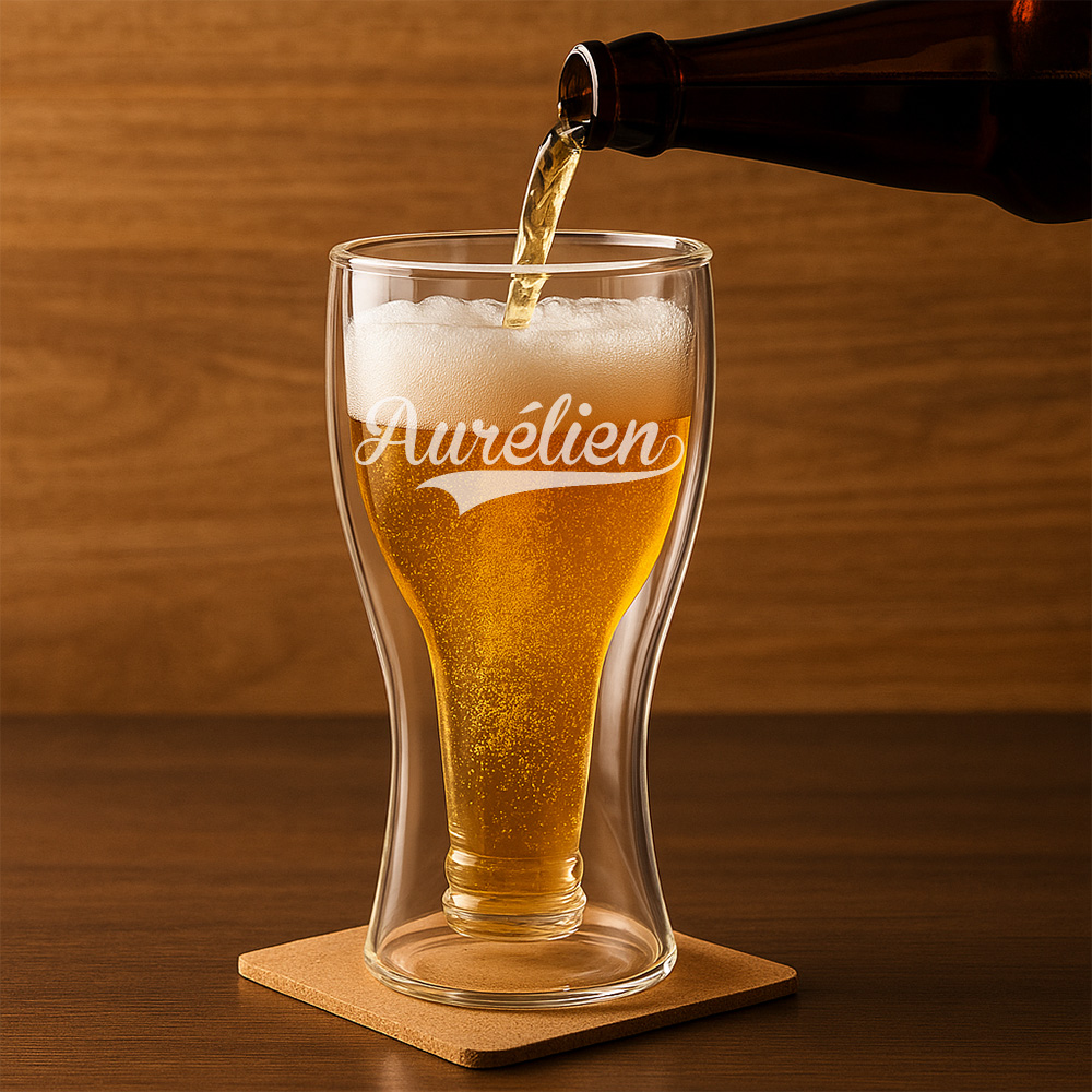 Ce verre à bière personnalisé met à l’honneur un prénom de façon élégante et discrète. Gravé à l’horizontale dans une typographie moderne et fluide, le design s’intègre naturellement sur le verre et crée une signature unique. Cette disposition simple et raffinée séduit par sa lisibilité et son équilibre, parfaite pour faire plaisir avec goût et sans en faire trop.