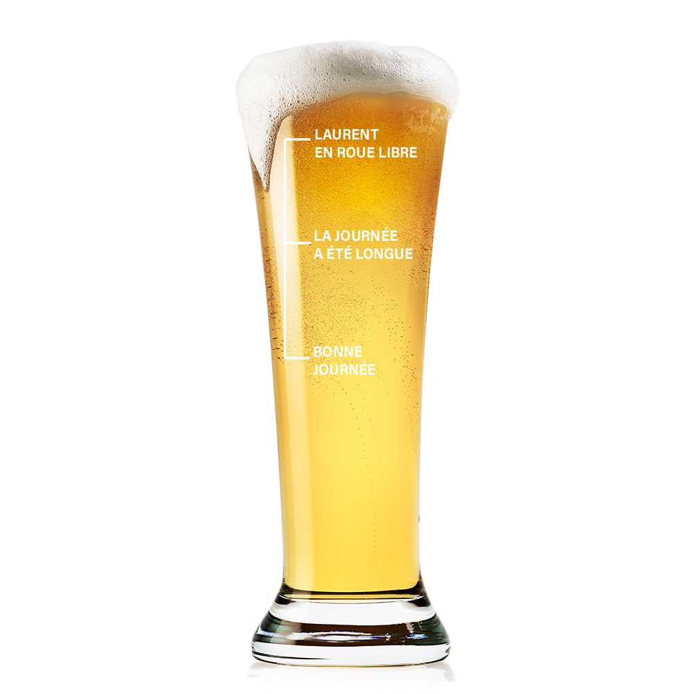 Avec son look de verre doseur revisité, ce verre à bière personnalisé fait le plein de bonne humeur. Trois lignes personnalisables en guise de graduations permettent d'inscrire vos propres doses : dose de courage, dose de détente, dose de fête… ou toute autre formule qui fera sourire son destinataire. Ce design ludique est idéal pour offrir un cadeau original, complice et plein d’humour, à un amateur de bière qui aime savourer chaque gorgée avec style.